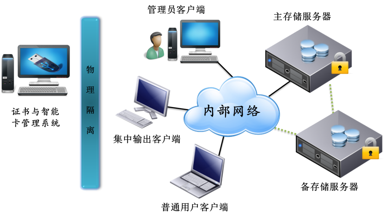 网云天机网络集中安全存储系统由服务端和客户端两部分构成,服务端主要包括:存储服务器集群、安全存储服务系统;客户端包括:普通用户客户端、管理员客户端、集中输出客户端(数据摆渡站)、证书和智能卡管理系统。